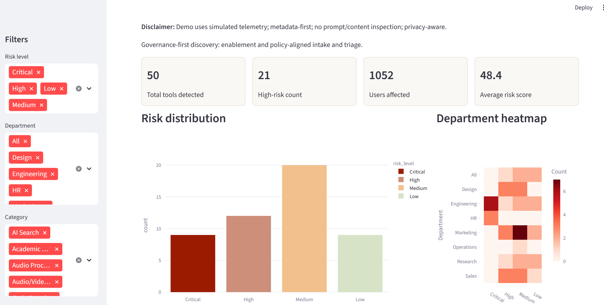 To explore how this intake and visibility model could be implemented in practice, I built a lightweight, metadata-first Shadow AI discovery simulation.
